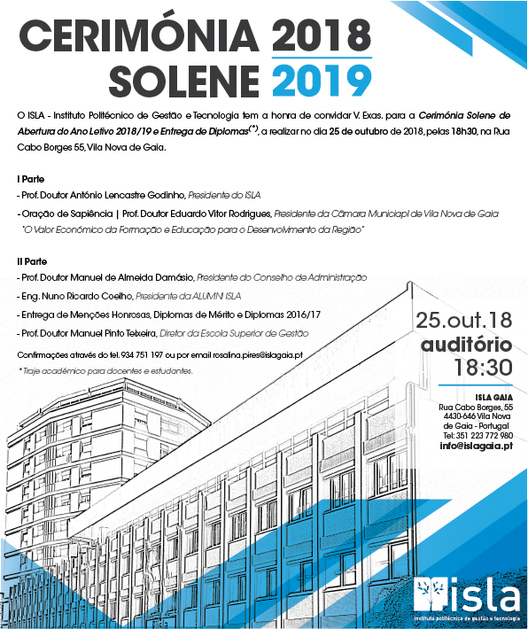 O ISLA - Instituto Politécnico de Gestão e Tecnologia, tem o grato prazer de convidar V. Exa. a assistir à Cerimónia Solene de Abertura do Ano Letivo 2018/2019 e Entrega de Diplomas 2016/17, a qual terá lugar no próximo dia 25 de outubro, 5ª feira, pelas 18h30, no Auditório desta Instituição.