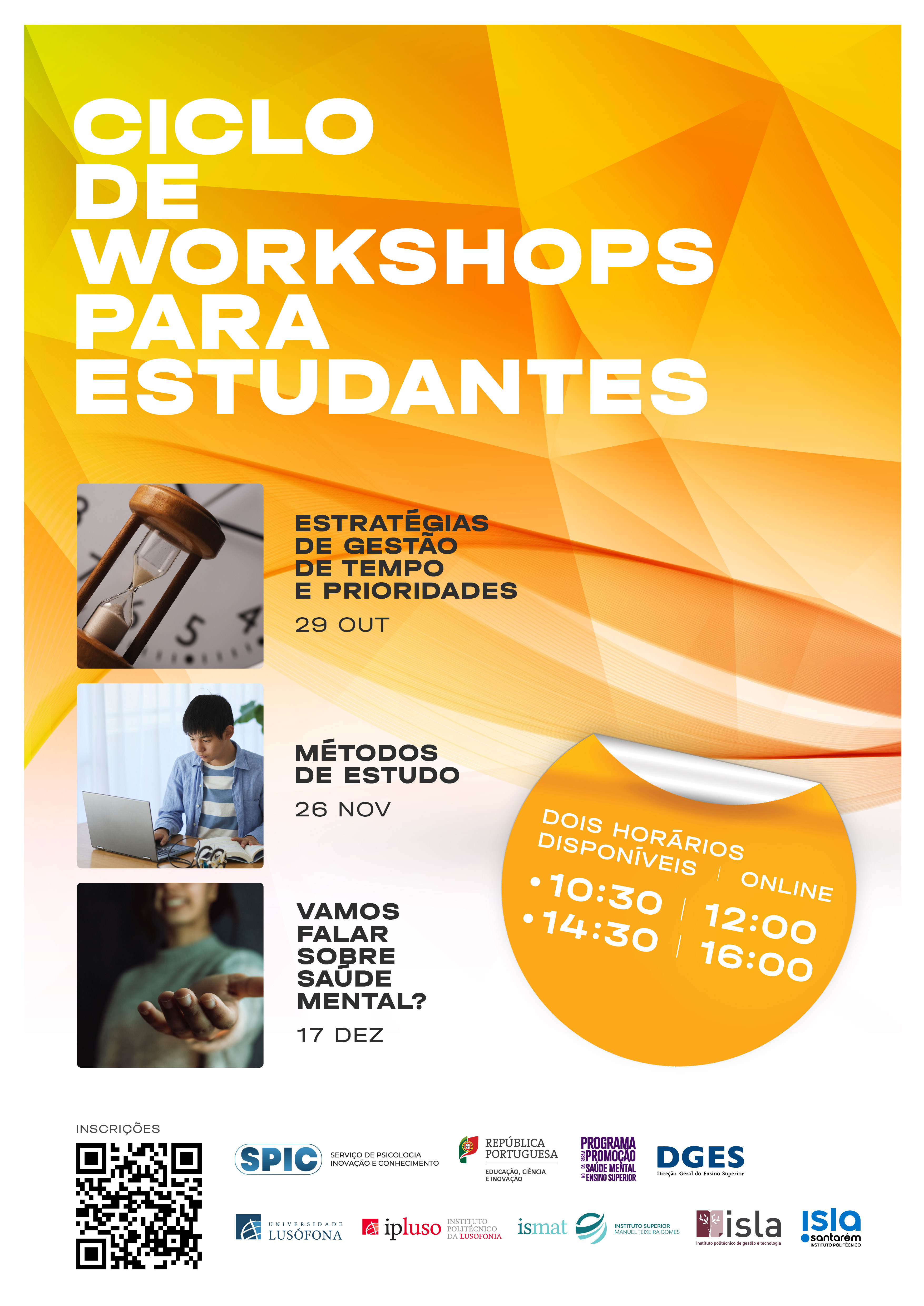 O SPIC – Serviço de Psicologia e Inovação e Conhecimento preparou um conjunto de workshops gratuitos onde pode aprender a gerir o tempo e prioridades, ter métodos de estudo participar num espaço de partilha e aprendizagem que pretende contribuir para um maior entendimento sobre a saúde mental.