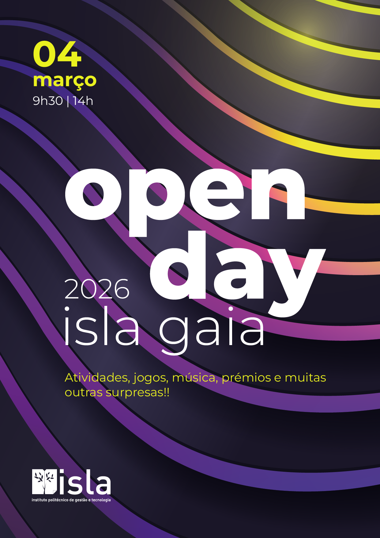 Se ainda tens dúvidas sobre qual será o teu próximo curso, no Openday 2026 do ISLA Gaia vais poder experimentar atividades de várias áreas, perceber na prática o que se faz em cada uma e decidir com mais confiança. Não faltes — vamos ter muita animação, prémios e surpresas!