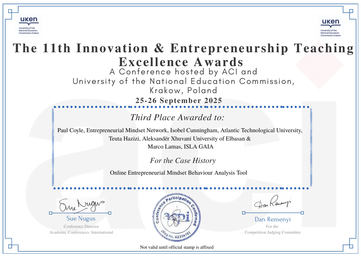 Esta ferramenta ajuda os docentes a introduzir os estudantes à mentalidade empreendedora — independentemente da sua área académica. Sentimo-nos honrados por os juízes da ECIE 2025 terem reconhecido a contribuição desta ferramenta para a educação empreendedora em todo o mundo. Explore a ferramenta e veja como pode apoiar o seu ensino em https://entrepreneurial-mindset.mba